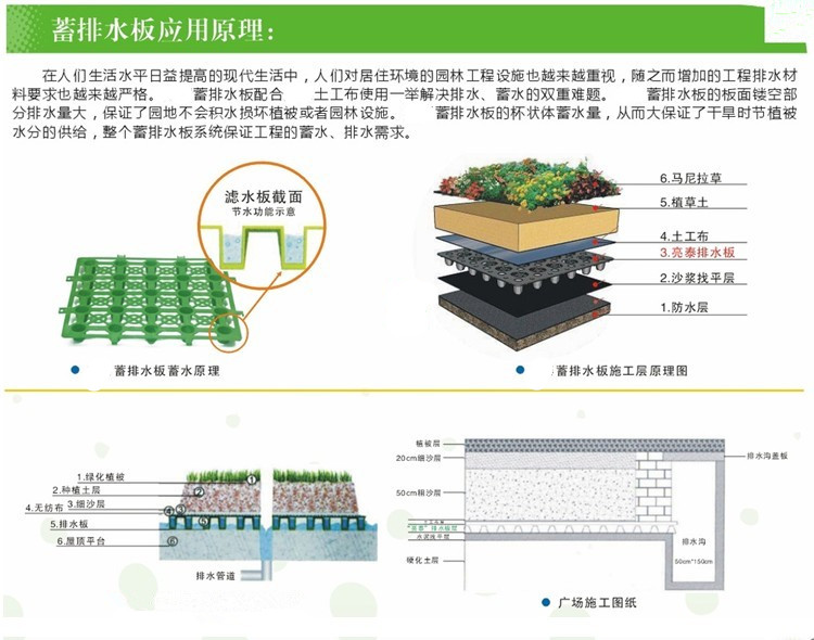 產(chǎn)品特點(diǎn):蓄排水板有效解決了傳統(tǒng)造景方式(如采用鵝卵石、貝殼、陶粒等作為濾水材料)不能儲(chǔ)水、不能防止植物根系破壞表面、不能保溫隔熱、荷載大等缺點(diǎn);同時(shí)具備蓄水、排水、透氣、保溫隔熱和防根刺五大突出功能;大面積使用可以達(dá)到節(jié)水、節(jié)電、隔音等功效,有效減緩城市的“熱島效應(yīng)”。
